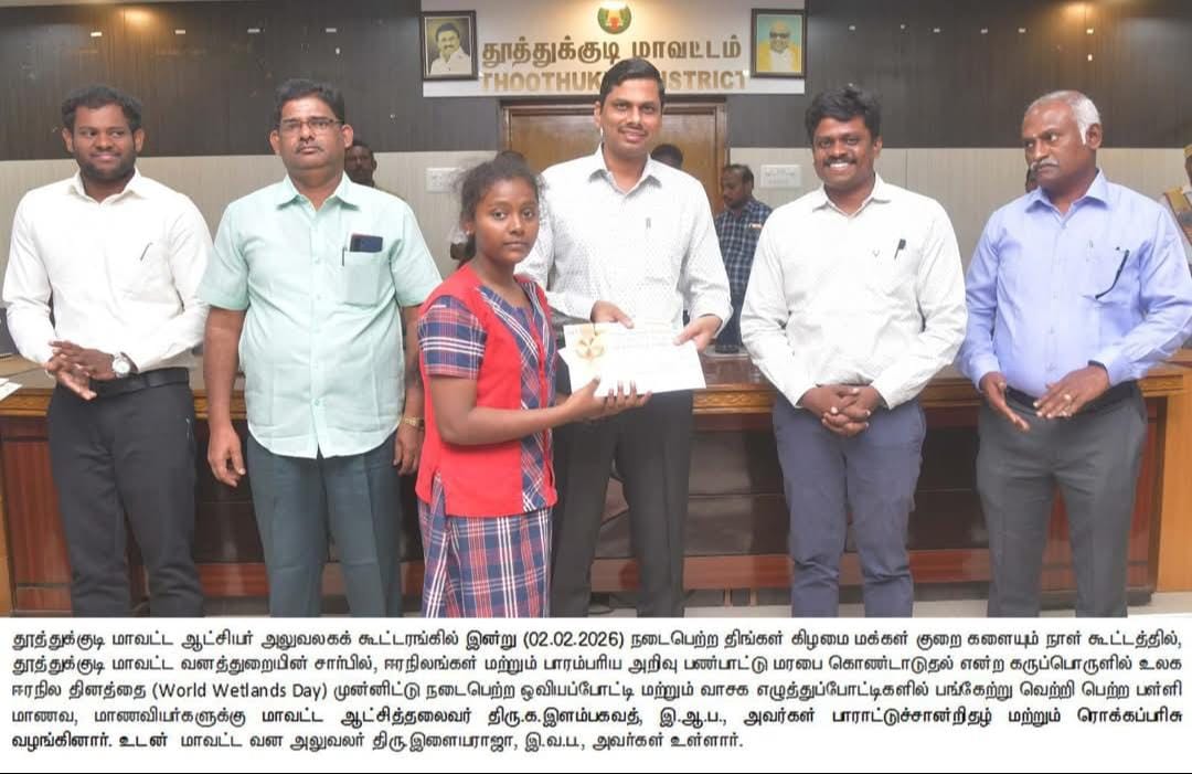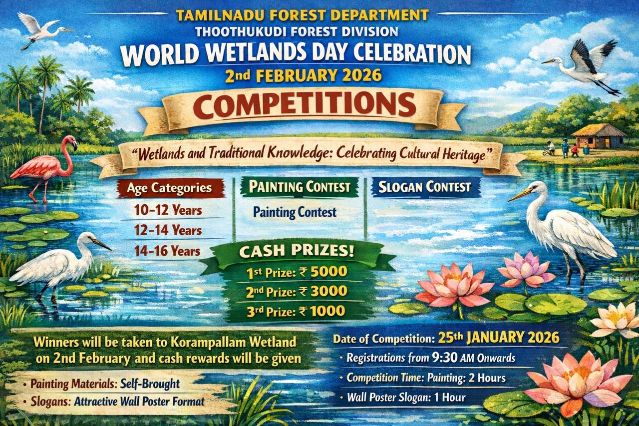 Thoothukudi Forest Division, is organizing competitions to celebrate World Wetlands Day 2026 on the theme “Wetlands and Traditional Knowledge: Celebrating Cultural Heritage.” The event will be held on 25th January 2026, with painting and slogan contests for students aged 10 to 16 years. Participants can compete for cash prizes, and winners will be honored during the World Wetlands Day celebration on 2nd February 2026 at Korampallam Wetland