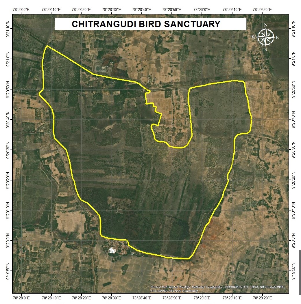 The Sanctuary is 5 km from Mudukulathur and 25 km away from Paramakudi of Ramanathapuram. The wetland is a protected area since 1989 and declared as Bird Sanctuary. Internationally, Chitrangudi comes under the Important Bird and Biodiversity Area. (IBA; code IN261, Criteria A1, A4i) as reported by Bird Life International and Wetlands International, besides being part of the Key Biodiversity Areas of the world The crescent-shaped Kanmoi starts at a northern point where an aqueduct from the Gundar River flows into the Kanmoi. The Sanctuary area is within the 15 m (49 ft) high embankments of a community irrigation tank. The total length of the embankment is 4.01 km (2.492 miles). Area calculated as 260.47 ha. The fluvial landforms near Chitrangudi wetland comprises of flood plains of Vaigai, Varshalei, Pambar, Kottakkarai and Gundar rivers. The marine landforms comprise sand mounds (Teri?s) and barrier dunes along the coast. Main source of water for the wetland is rainfall, groundwater, the surrounding runoff from the catchment area and from the Vaigai and Gundaru Rivers. As the wetland is mostly dependent on the rainfall and runoff waters. This helps in replenishing the groundwater.