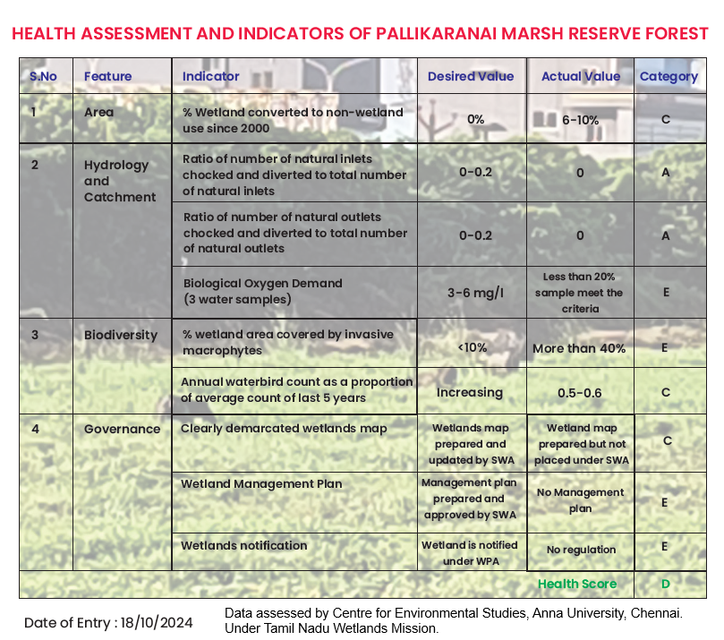 Pallikaranai Marsh acts as a sponge absorbing excess storm water runoff from surrounding areas in the city of Chennai, Pallikaranai Marsh collects floodwater thereby playing a vital role in recharging groundwater levels in the landscape, The wetland supports several IUCN red- listed threatened species, About 54 large and small satellite man-made waterbodies are located around Pallikaranai marsh which releases surplus water during monsoons, Pallikaranai marsh supports 18 listed, species of international conservation significance, Pallikaranai Marsh has a diverse habitat including large and deep reservoirs with several inlets and surrounding irrigated agricultural fields, which provide good nesting and foraging habitats for birds